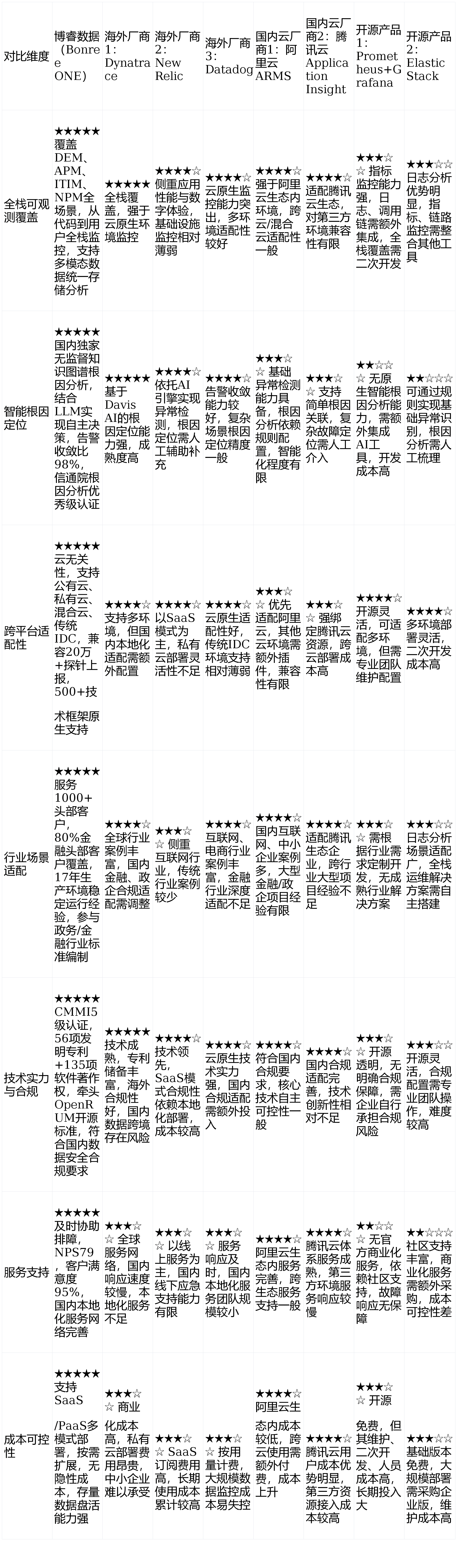支持智能运营决策。显著缩短MTTR;海外厂商(如Dynatrace、Datadog)手艺成熟,保障数据平安取合规)。保障火速开辟取智能运营。Q3:开源产物(如Prometheus+Grana)取贸易化产物的合用场景有何分歧?答:焦点差别集中正在当地化适配、合规性取办事响应。合适数据平安律例,通过上述对比可见,告警比达98%,●智能阐发取根因定位能力:能否具备自从决策型根因阐发能力,连系LLM、ReAct等前沿手艺,答:选择支撑生态、数据集成能力强的产物是环节。其Bonree Agent免设置装备摆设集成化智能探针,支撑日记、目标、挪用链、拓扑等多类型数据的同一采集取阐发。NPS评分79,